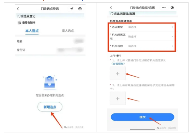 三、阅读门诊选点告知书并勾选已阅读并同意后,点击新增选点,选点类型选择“就医定点医疗机构登记”,选择机构所属区域,机构名称输入“清远市第三人民医院”,并上传签字版《普通门诊定点医疗机构选定表》及有效身份证件或社会保障卡,最后点击“提交”,审核通过即生效。